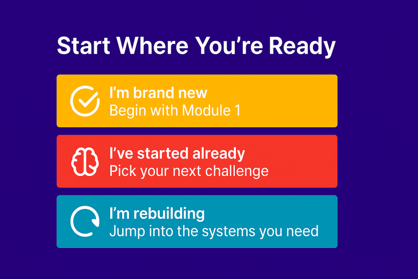 You donât have to go in order. Pick the module that meets you where you areâwhether youâre launching, relaunching, or scaling.